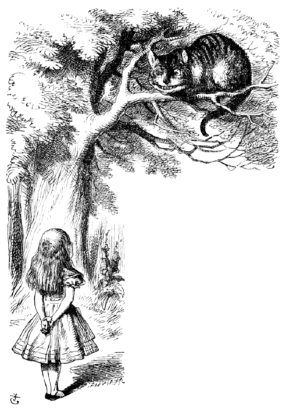 ‘Cheshire Puss,’ she began, rather timidly, as she did not at all know whether it would like the name: however, it only grinned a little wider. ‘Come, it’s pleased so far,’ thought Alice, and she went on. ‘Would you tell me, please, which way I ought to go from here?’