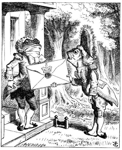 The Fish-Footman began by producing from under his arm a great letter, nearly as large as himself, and this he handed over to the other, saying, in a solemn tone, ‘For the Duchess. An invitation from the Queen to play croquet.’ The Frog-Footman repeated, in the same solemn tone, only changing the order of the words a little, ‘From the Queen. An invitation for the Duchess to play croquet.’