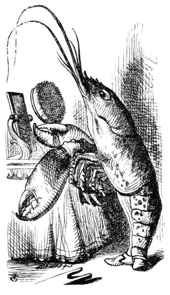 ‘‘Tis the voice of the Lobster; I heard him declare,“You have baked me too brown, I must sugar my hair.”As a duck with its eyelids, so he with his noseTrims his belt and his buttons, and turns out his toes.’When the sands are all dry, he is gay as a lark,And will talk in contemptuous tones of the Shark,But, when the tide rises and sharks are around,His voice has a timid and tremulous sound.