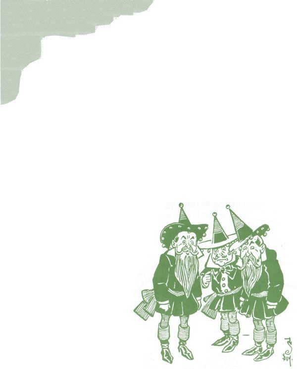 Three were men and one a woman, and all were oddly dressed. They wore round hats that rose to a small point a foot above their heads, with little bells around the brims that tinkled sweetly as they moved. The hats of the men were blue; the little woman's hat was white, and she wore a white gown that hung in plaits from her shoulders; over it were sprinkled little stars that glistened in the sun like diamonds. The men were dressed in blue, of the same shade as their hats, and wore well polished boots with a deep roll of blue at the tops. The men, Dorothy thought, were about as old as Uncle Henry, for two of them had beards. But the little woman was doubtless much older: her face was covered with wrinkles, her hair was nearly white, and she walked rather stiffly.