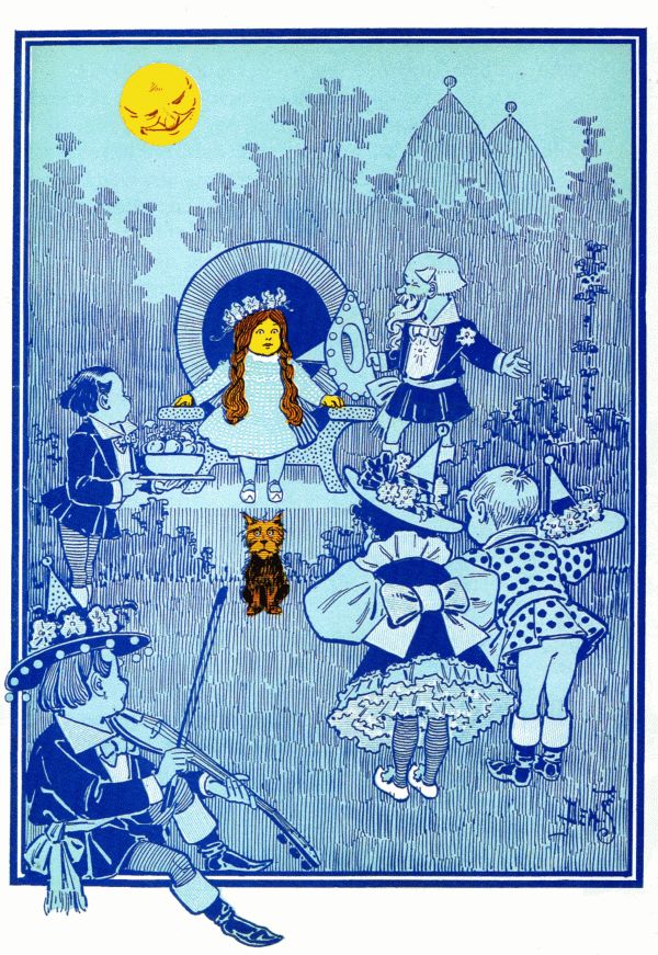 Towards evening, when Dorothy was tired with her long walk and began to wonder where she should pass the night, she came to a house rather larger than the rest. On the green lawn before it many men and women were dancing. Five little fiddlers played as loudly as possible and the people were laughing and singing, while a big table near by was loaded with delicious fruits and nuts, pies and cakes, and many other good things to eat.