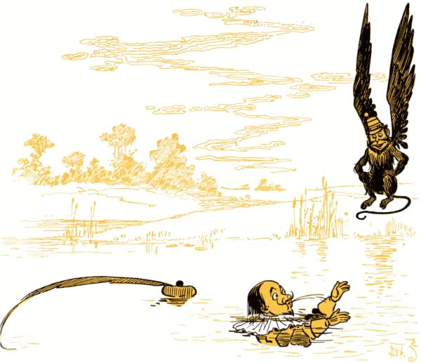 "My grandfather was at that time the King of the Winged Monkeys which lived in the forest near Gayalette's palace, and the old fellow loved a joke better than a good dinner. One day, just before the wedding, my grandfather was flying out with his band when he saw Quelala walking beside the river. He was dressed in a rich costume of pink silk and purple velvet, and my grandfather thought he would see what he could do. At his word the band flew down and seized Quelala, carried him in their arms until they were over the middle of the river, and then dropped him into the water.