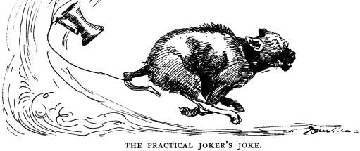 Sir Dinadan the Humorist was the first to awake, and he soon roused the rest with a practical joke of a sufficiently poor quality. He tied some metal mugs to a dog’s tail and turned him loose, and he tore around and around the place in a frenzy of fright, with all the other dogs bellowing after him and battering and crashing against everything that came in their way and making altogether a chaos of confusion and a most deafening din and turmoil; at which every man and woman of the multitude laughed till the tears flowed, and some fell out of their chairs and wallowed on the floor in ecstasy. It was just like so many children. Sir Dinadan was so proud of his exploit that he could not keep from telling over and over again, to weariness, how the immortal idea happened to occur to him; and as is the way with humorists of his breed, he was still laughing at it after everybody else had got through.