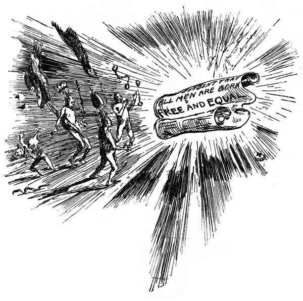 Inherited ideas are a curious thing, and interesting to observe and examine. I had mine, the king and his people had theirs. In both cases they flowed in ruts worn deep by time and habit, and the man who should have proposed to divert them by reason and argument would have had a long contract on his hands. For instance, those people had inherited the idea that all men without title and a long pedigree, whether they had great natural gifts and acquirements or hadn’t, were creatures of no more consideration than so many animals, bugs, insects; whereas I had inherited the idea that human daws who can consent to masquerade in the peacock-shams of inherited dignities and unearned titles, are of no good but to be laughed at. The way I was looked upon was odd, but it was natural. You know how the keeper and the public regard the elephant in the menagerie: well, that is the idea. They are full of admiration of his vast bulk and his prodigious strength; they speak with pride of the fact that he can do a hundred marvels which are far and away beyond their own powers; and they speak with the same pride of the fact that in his wrath he is able to drive a thousand men before him. But does that make him one of them? No; the raggedest tramp in the pit would smile at the idea. He couldn’t comprehend it; couldn’t take it in; couldn’t in any remote way conceive of it. Well, to the king, the nobles, and all the nation, down to the very slaves and tramps, I was just that kind of an elephant, and nothing more. I was admired, also feared; but it was as an animal is admired and feared. The animal is not reverenced, neither was I; I was not even respected. I had no pedigree, no inherited title; so in the king’s and nobles’ eyes I was mere dirt; the people regarded me with wonder and awe, but there was no reverence mixed with it; through the force of inherited ideas they were not able to conceive of anything being entitled to that except pedigree and lordship. There you see the hand of that awful power, the Roman Catholic Church. In two or three little centuries it had converted a nation of men to a nation of worms. Before the day of the Church’s supremacy in the world, men were men, and held their heads up, and had a man’s pride and spirit and independence; and what of greatness and position a person got, he got mainly by achievement, not by birth. But then the Church came to the front, with an axe to grind; and she was wise, subtle, and knew more than one way to skin a cat—or a nation; she invented “divine right of kings,” and propped it all around, brick by brick, with the Beatitudes—wrenching them from their good purpose to make them fortify an evil one; she preached (to the commoner) humility, obedience to superiors, the beauty of self-sacrifice; she preached (to the commoner) meekness under insult; preached (still to the commoner, always to the commoner) patience, meanness of spirit, non-resistance under oppression; and she introduced heritable ranks and aristocracies, and taught all the Christian populations of the earth to bow down to them and worship them.