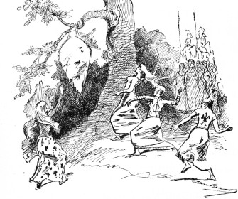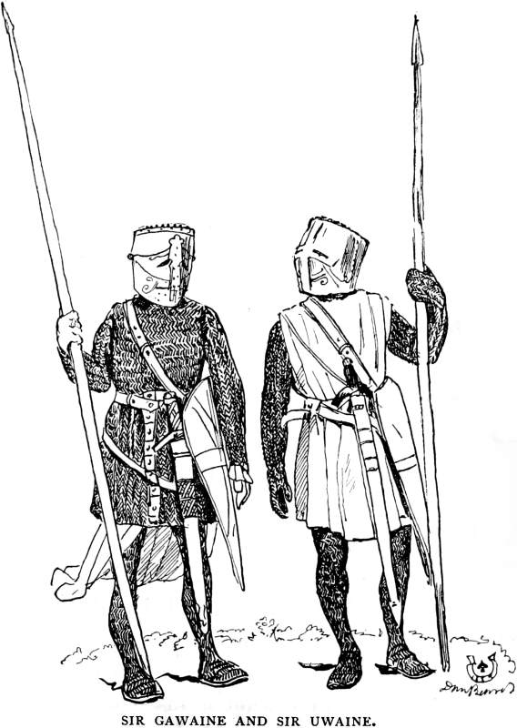 “Sir Gawaine and Sir Uwaine. And so they came to an abbey of monks, and there were well lodged. So on the morn they heard their masses in the abbey, and so they rode forth till they came to a great forest; then was Sir Gawaine ware in a valley by a turret, of twelve fair damsels, and two knights armed on great horses, and the damsels went to and fro by a tree. And then was Sir Gawaine ware how there hung a white shield on that tree, and ever as the damsels came by it they spit upon it, and some threw mire upon the shield—”