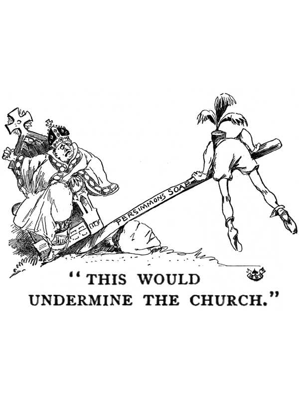 My missionaries were taught to spell out the gilt signs on their tabards—the showy gilding was a neat idea, I could have got the king to wear a bulletin-board for the sake of that barbaric splendor—they were to spell out these signs and then explain to the lords and ladies what soap was; and if the lords and ladies were afraid of it, get them to try it on a dog. The missionary’s next move was to get the family together and try it on himself; he was to stop at no experiment, however desperate, that could convince the nobility that soap was harmless; if any final doubt remained, he must catch a hermit—the woods were full of them; saints they called themselves, and saints they were believed to be. They were unspeakably holy, and worked miracles, and everybody stood in awe of them. If a hermit could survive a wash, and that failed to convince a duke, give him up, let him alone.