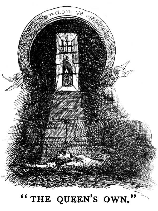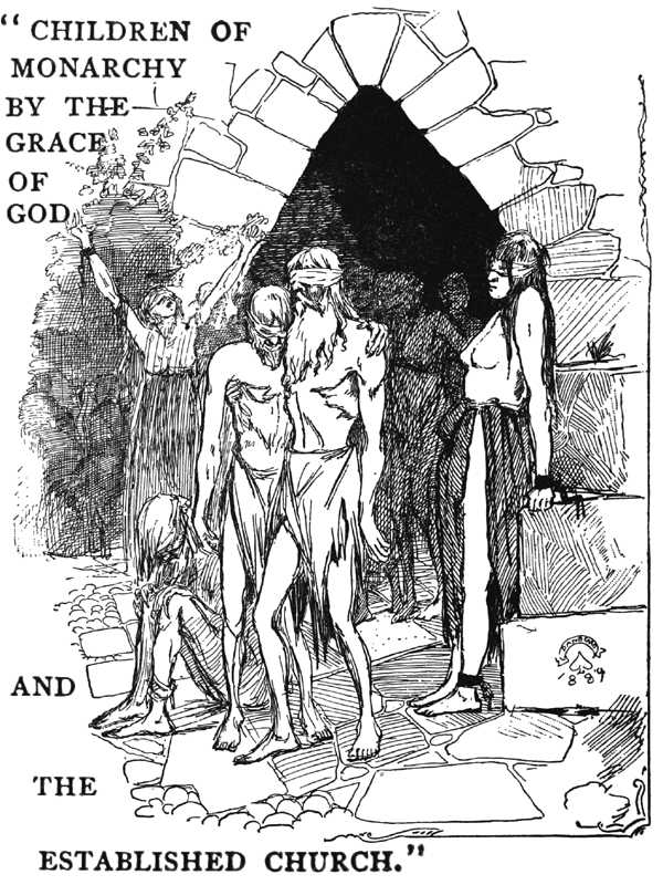 When I brought my procession of human bats up into the open world and the glare of the afternoon sun—previously blindfolding them, in charity for eyes so long untortured by light—they were a spectacle to look at. Skeletons, scarecrows, goblins, pathetic frights, every one; legitimatest possible children of Monarchy by the Grace of God and the Established Church. I muttered absently: