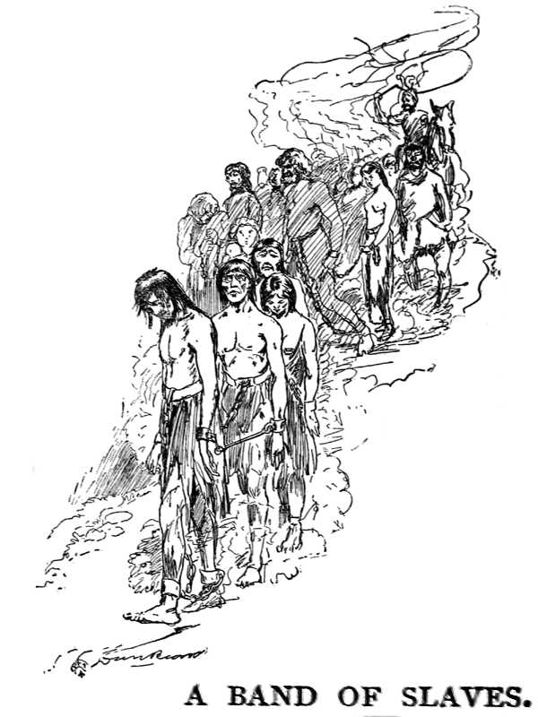 Early in the afternoon we overtook another procession of pilgrims; but in this one was no merriment, no jokes, no laughter, no playful ways, nor any happy giddiness, whether of youth or age. Yet both were here, both age and youth; gray old men and women, strong men and women of middle age, young husbands, young wives, little boys and girls, and three babies at the breast. Even the children were smileless; there was not a face among all these half a hundred people but was cast down, and bore that set expression of hopelessness which is bred of long and hard trials and old acquaintance with despair. They were slaves. Chains led from their fettered feet and their manacled hands to a sole-leather belt about their waists; and all except the children were also linked together in a file six feet apart, by a single chain which led from collar to collar all down the line. They were on foot, and had tramped three hundred miles in eighteen days, upon the cheapest odds and ends of food, and stingy rations of that. They had slept in these chains every night, bundled together like swine. They had upon their bodies some poor rags, but they could not be said to be clothed. Their irons had chafed the skin from their ankles and made sores which were ulcerated and wormy. Their naked feet were torn, and none walked without a limp. Originally there had been a hundred of these unfortunates, but about half had been sold on the trip. The trader in charge of them rode a horse and carried a whip with a short handle and a long heavy lash divided into several knotted tails at the end. With this whip he cut the shoulders of any that tottered from weariness and pain, and straightened them up. He did not speak; the whip conveyed his desire without that. None of these poor creatures looked up as we rode along by; they showed no consciousness of our presence. And they made no sound but one; that was the dull and awful clank of their chains from end to end of the long file, as forty-three burdened feet rose and fell in unison. The file moved in a cloud of its own making.