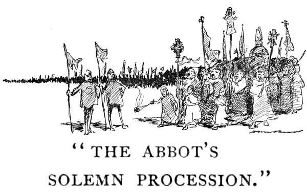 I was at the platform and all ready to do the honors when the abbot’s solemn procession hove in sight—which it did not do till it was nearly to the rope fence, because it was a starless black night and no torches permitted. With it came Merlin, and took a front seat on the platform; he was as good as his word for once. One could not see the multitudes banked together beyond the ban, but they were there, just the same. The moment the bells stopped, those banked masses broke and poured over the line like a vast black wave, and for as much as a half hour it continued to flow, and then it solidified itself, and you could have walked upon a pavement of human heads to—well, miles.