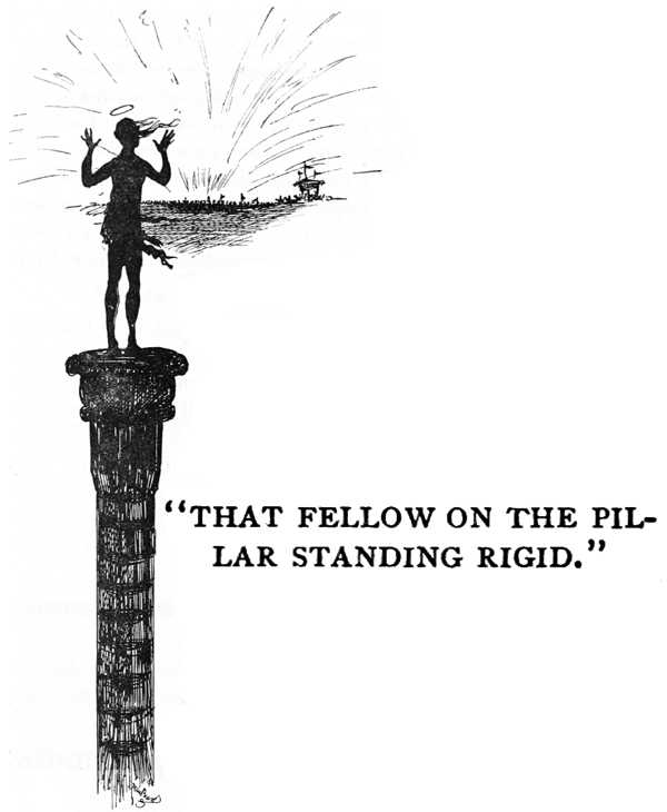 —and whirled on the purple glare! There they were, all going at once, red, blue, green, purple!—four furious volcanoes pouring vast clouds of radiant smoke aloft, and spreading a blinding rainbowed noonday to the furthest confines of that valley. In the distance one could see that fellow on the pillar standing rigid against the background of sky, his seesaw stopped for the first time in twenty years. I knew the boys were at the pump now and ready. So I said to the abbot: