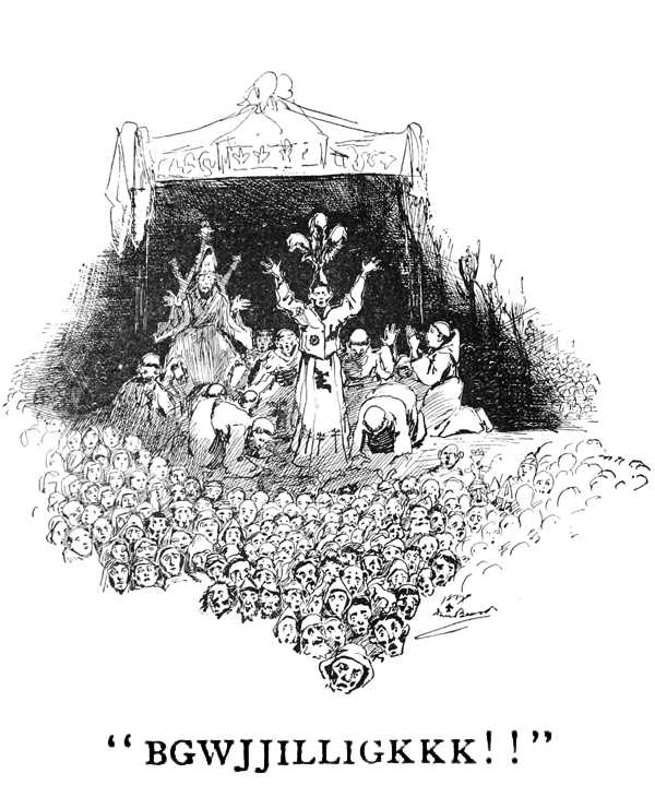 We had a solemn stage-wait, now, for about twenty minutes—a thing I had counted on for effect; it is always good to let your audience have a chance to work up its expectancy. At length, out of the silence a noble Latin chant—men’s voices—broke and swelled up and rolled away into the night, a majestic tide of melody. I had put that up, too, and it was one of the best effects I ever invented. When it was finished I stood up on the platform and extended my hands abroad, for two minutes, with my face uplifted—that always produces a dead hush—and then slowly pronounced this ghastly word with a kind of awfulness which caused hundreds to tremble, and many women to faint: