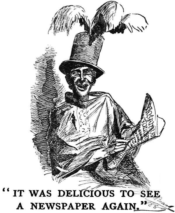 I dropped a nickel out of the window and got my paper; the Adam-newsboy of the world went around the corner to get my change; is around the corner yet. It was delicious to see a newspaper again, yet I was conscious of a secret shock when my eye fell upon the first batch of display head-lines. I had lived in a clammy atmosphere of reverence, respect, deference, so long that they sent a quivery little cold wave through me: