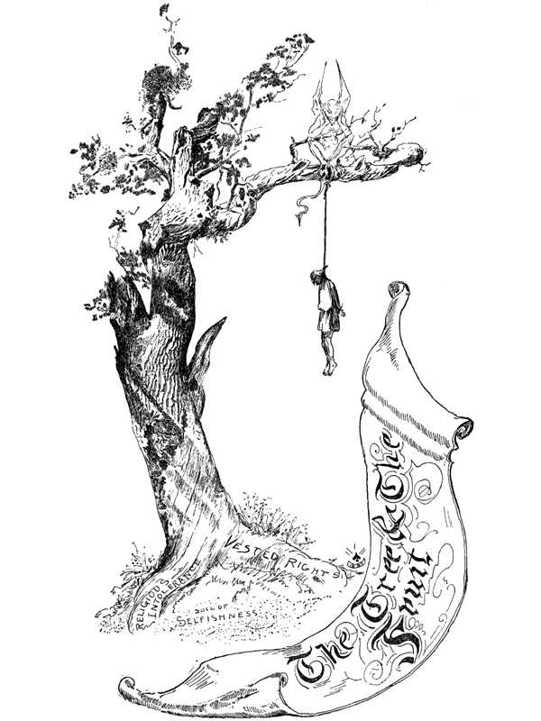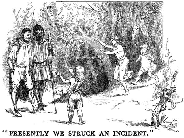 Presently we struck an incident. A small mob of half-naked boys and girls came tearing out of the woods, scared and shrieking. The eldest among them were not more than twelve or fourteen years old. They implored help, but they were so beside themselves that we couldn’t make out what the matter was. However, we plunged into the wood, they skurrying in the lead, and the trouble was quickly revealed: they had hanged a little fellow with a bark rope, and he was kicking and struggling, in the process of choking to death. We rescued him, and fetched him around. It was some more human nature; the admiring little folk imitating their elders; they were playing mob, and had achieved a success which promised to be a good deal more serious than they had bargained for.