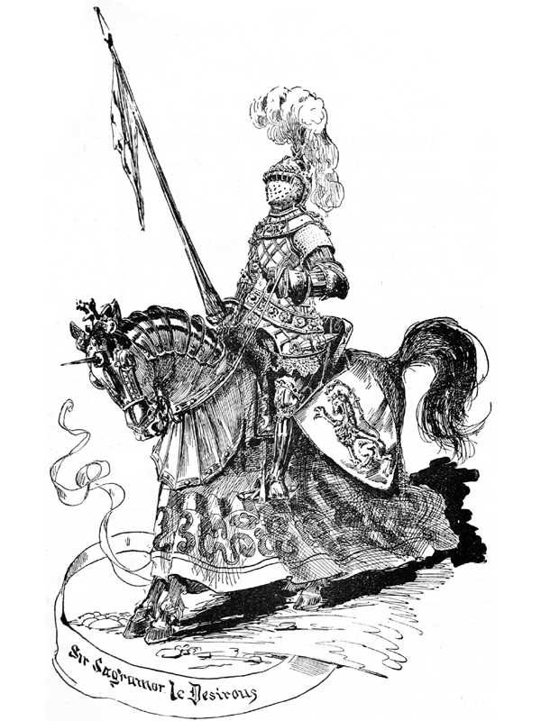 Out from his tent rode great Sir Sagramor, an imposing tower of iron, stately and rigid, his huge spear standing upright in its socket and grasped in his strong hand, his grand horse’s face and breast cased in steel, his body clothed in rich trappings that almost dragged the ground—oh, a most noble picture. A great shout went up, of welcome and admiration.