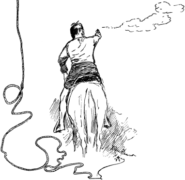 Bzz! Here he came, like a house afire; I dodged: he passed like a flash, with my horse-hair coils settling around his neck; a second or so later, fst! his saddle was empty.