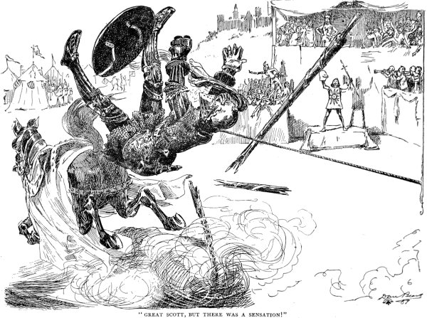 It was an even bet that Clarence had procured that favor for me—and furnished the language, too. When that formidable lance-point was within a yard and a half of my breast I twitched my horse aside without an effort, and the big knight swept by, scoring a blank. I got plenty of applause that time. We turned, braced up, and down we came again. Another blank for the knight, a roar of applause for me. This same thing was repeated once more; and it fetched such a whirlwind of applause that Sir Sagramor lost his temper, and at once changed his tactics and set himself the task of chasing me down. Why, he hadn’t any show in the world at that; it was a game of tag, with all the advantage on my side; I whirled out of his path with ease whenever I chose, and once I slapped him on the back as I went to the rear. Finally I took the chase into my own hands; and after that, turn, or twist, or do what he would, he was never able to get behind me again; he found himself always in front at the end of his maneuver. So he gave up that business and retired to his end of the lists. His temper was clear gone now, and he forgot himself and flung an insult at me which disposed of mine. I slipped my lasso from the horn of my saddle, and grasped the coil in my right hand. This time you should have seen him come!—it was a business trip, sure; by his gait there was blood in his eye. I was sitting my horse at ease, and swinging the great loop of my lasso in wide circles about my head; the moment he was under way, I started for him; when the space between us had narrowed to forty feet, I sent the snaky spirals of the rope a-cleaving through the air, then darted aside and faced about and brought my trained animal to a halt with all his feet braced under him for a surge. The next moment the rope sprang taut and yanked Sir Sagramor out of the saddle! Great Scott, but there was a sensation!