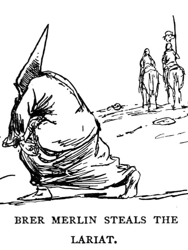 Said I to myself, as I coiled my lariat and hung it on my saddle-horn, and sat there drunk with glory, “The victory is perfect—no other will venture against me—knight-errantry is dead.” Now imagine my astonishment—and everybody else’s, too—to hear the peculiar bugle-call which announces that another competitor is about to enter the lists! There was a mystery here; I couldn’t account for this thing. Next, I noticed Merlin gliding away from me; and then I noticed that my lasso was gone! The old sleight-of-hand expert had stolen it, sure, and slipped it under his robe.