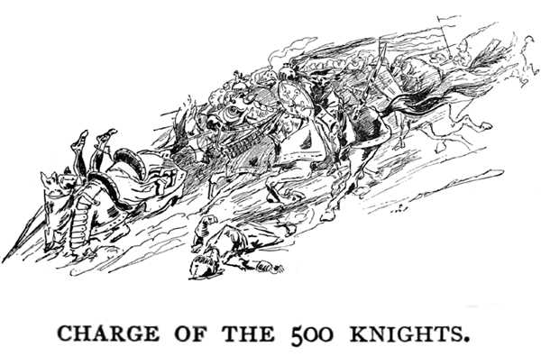 It was a “bluff” you know. At such a time it is sound judgment to put on a bold face and play your hand for a hundred times what it is worth; forty-nine times out of fifty nobody dares to “call,” and you rake in the chips. But just this once—well, things looked squally! In just no time, five hundred knights were scrambling into their saddles, and before you could wink a widely scattering drove were under way and clattering down upon me. I snatched both revolvers from the holsters and began to measure distances and calculate chances.