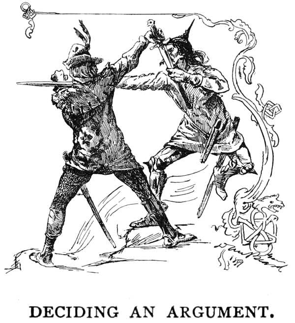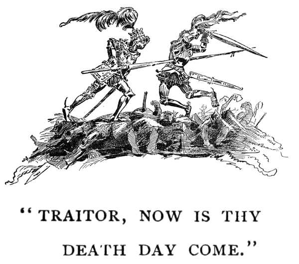 “Well, it was an accident. They were simply onlookers; they were unarmed, and were merely there to witness the queen’s punishment. Sir Launcelot smote down whoever came in the way of his blind fury, and he killed these without noticing who they were. Here is an instantaneous photograph one of our boys got of the battle; it’s for sale on every news-stand. There—the figures nearest the queen are Sir Launcelot with his sword up, and Sir Gareth gasping his latest breath. You can catch the agony in the queen’s face through the curling smoke. It’s a rattling battle-picture.”