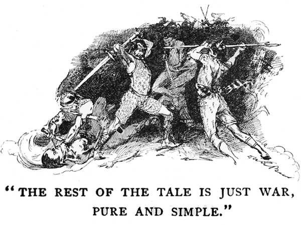 “Well, the rest of the tale is just war, pure and simple. Launcelot retreated to his town and castle of Joyous Gard, and gathered there a great following of knights. The king, with a great host, went there, and there was desperate fighting during several days, and, as a result, all the plain around was paved with corpses and cast-iron. Then the Church patched up a peace between Arthur and Launcelot and the queen and everybody—everybody but Sir Gawaine. He was bitter about the slaying of his brothers, Gareth and Gaheris, and would not be appeased. He notified Launcelot to get him thence, and make swift preparation, and look to be soon attacked. So Launcelot sailed to his Duchy of Guienne with his following, and Gawaine soon followed with an army, and he beguiled Arthur to go with him. Arthur left the kingdom in Sir Mordred’s hands until you should return—”